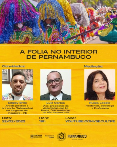 Live “Carnaval das Tradições: a folia no interior de Pernambuco”, com as participações de Luiz Carlos, Edgley Brito e Rúbia Lóssio (mediação)