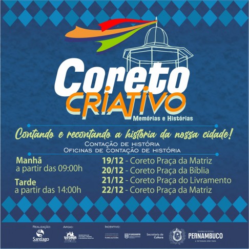 As praças públicas da cidade de Vitória de Santo Antão, na Mata Sul, vão receber, a partir desta segunda-feira (19), as ações do projeto “Coreto Criativo – Memórias e Histórias”. A iniciativa, que conta com incentivo do Governo de Pernambuco, por meio dos recursos do Funcultura, é um projeto de contação de histórias que visa promover atividades educacionais, com foco no patrimônio, memória e história da cidade, tendo os coretos como espaço cultural de difusão lúdica e fruição artística.
