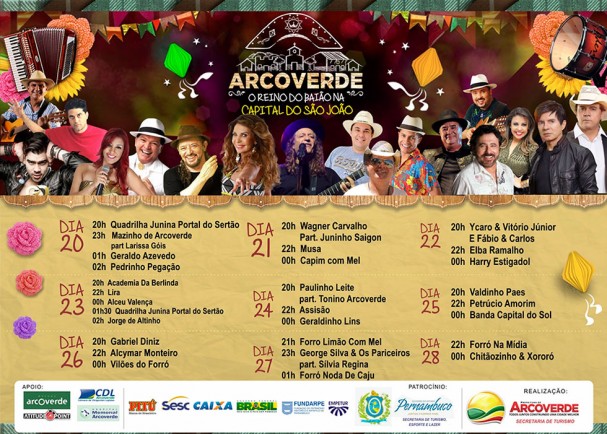 Contando com incentivo do Governo de Pernambuco, através da Fundarpe e Empetur, a cidade de Arcoverde, no Sertão, realizará de 20 a 28 de junho, o seu São João 2015. Possuindo o tema “O Reino do Baião na Capital do São João”, o evento visa proporcionar ao público a mistura de ritmos atrelada as vocações culturais da região do Moxotó, com uma grade composta por 70% de atrações pernambucanas. Estrarão se apresentando ao longo dos 8 dias de celebração,  Chitãozinho e Chororó, Geraldo Azevedo, Alceu Valença, Lirinha, Elba Ramalho, Jorge de Altinho, Gabriel Diniz e Alcymar Monteiro.