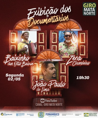 A trajetória de vida dos mestres Zeca Cirandeiro, de Paudalho, Baixinho dos Oito Baixos, de Vicência, e João Paulo de Lima (Escada) ganharam documentários que serão exibidos nesta segunda-feira (2), às 19h30, no canal Giro Mata Norte do YouTube (www.youtube.com/channel/UC1Is9bwMJXHT3AFCAB5wu_Q/videos). Os vídeos foram produzidos com os recursos da Lei Aldir Blanc em Pernambuco.