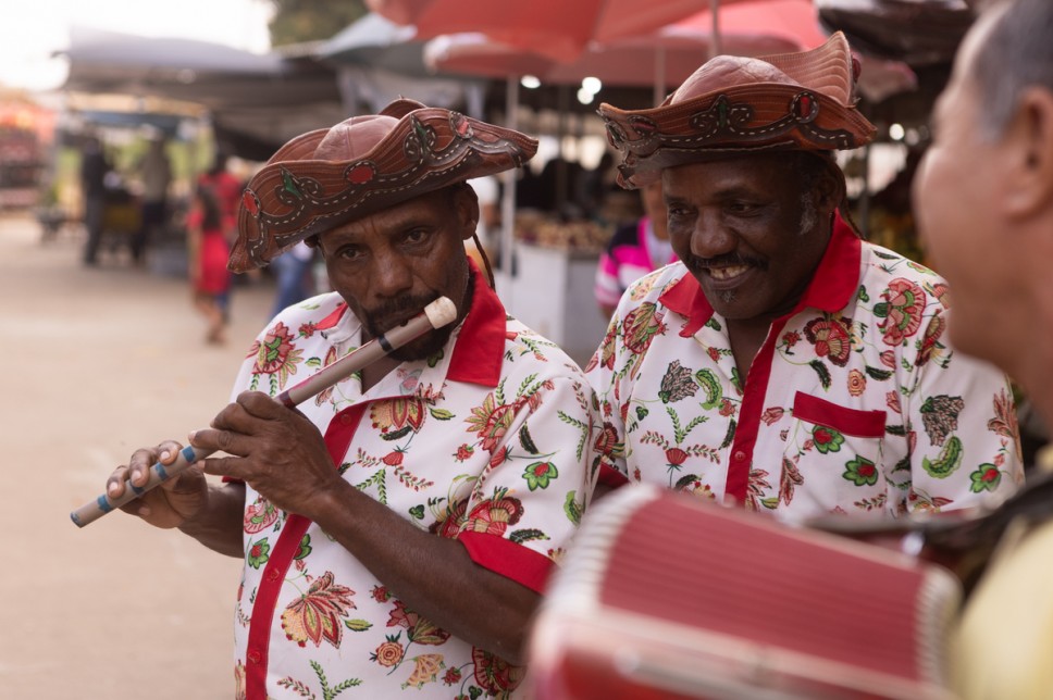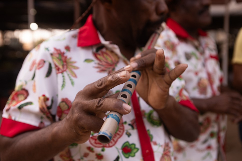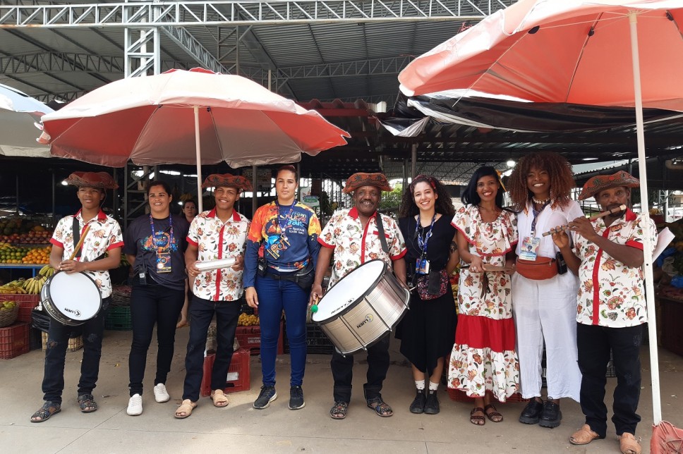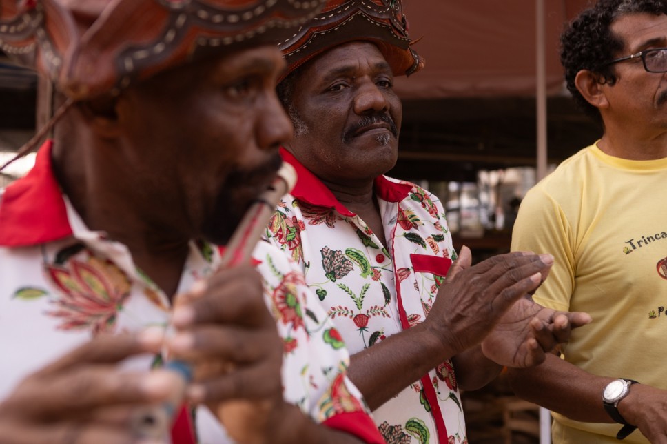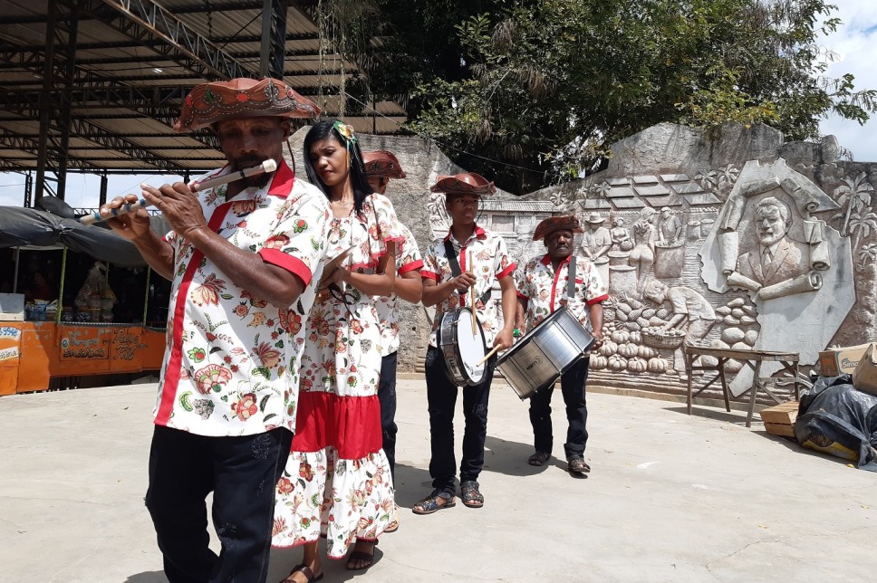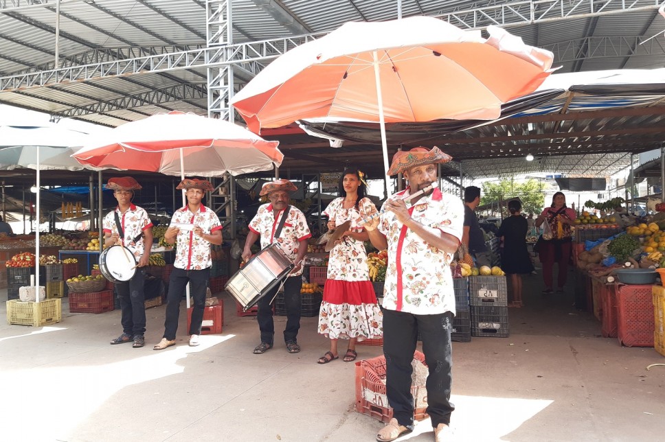 Músicos da Banda de Pífano Santa Luzia e dos Bacamarteiros Mandacaru se encontraram no intervalo, no Mercado Público, e fizeram uma bela gig