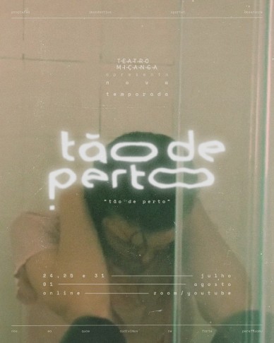Em julho, o Teatro Miçanga volta a encenar espetáculo virtual “Tão de Perto”. A curta temporada terá quatro sessões (nos dias 24, 25, 31 de julho e 1º de agosto, sempre às 19h) e as inscrições são pelo formulário disponível em: forms.gle/Yp3eTWJhUy2PKVus6. O ingresso é na modalidade contribuição voluntária, na qual o espectador escolhe o valor de contribuição, e a apresentação acontece de maneira síncrona via Zoom com transmissão em tempo real pelo YouTube.