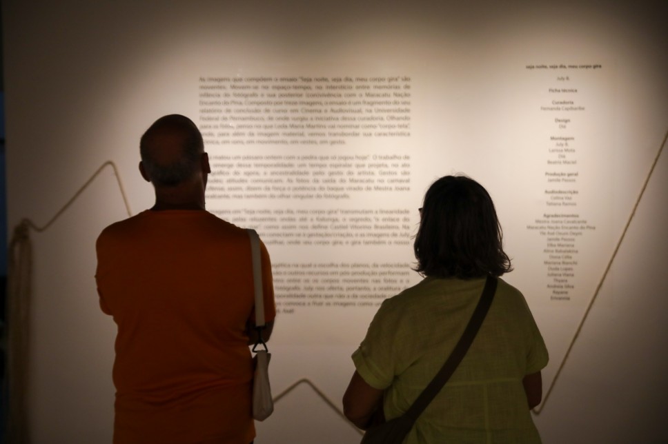 “As imagens de July Batista, que compõem o ensaio Seja Noite, Seja Dia, Meu Corpo Gira são moventes”, analisa a curadora Fernanda Capibaribe. “Movem-se no espaço-tempo, no interstício entre memórias de infância do fotógrafo e sua posterior (con)vivência com o Maracatu Encontro do Pina. Olhando para as fotos, penso no que Leda Maria Martins vai nominar como corpo-tela, em que, para além da imagem material, vemos transbordar sua característica icônica, em sons, em movimento, em vestes, em gesto. O ato de ver, aqui, não apanha apenas a aparência, mas algo mais profundo, que está entre nós e essa aparência, uma trama na qual os entornos do sujeito-memória e do maracatu são entrelaçados”, observa.