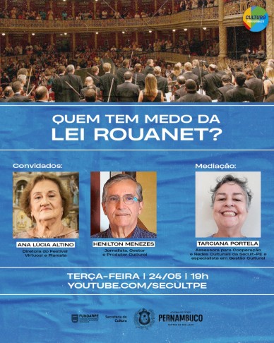 “Quem tem medo da Lei Rouanet” é o tema do programa Cultura em Rede que será transmitido na próxima terça (24), às 19h, no canal Youtube e também no Facebook da Secretaria de Cultura de Pernambuco (Secult-PE) e da Fundação do Patrimônio Histórico e Artístico de Pernambuco (Fundarpe). A Lei tem ocupado o noticiário por causa dos seguidos ataques sofridos, tanto por alguns artistas quanto por parlamentares e, mais ainda, pelas sucessivas deliberações e instruções normativas feitas pela Secretaria Especial de Cultura do Ministério do Turismo. Até o nome foi alterado e agora é apenas Lei de Incentivo à Cultura.