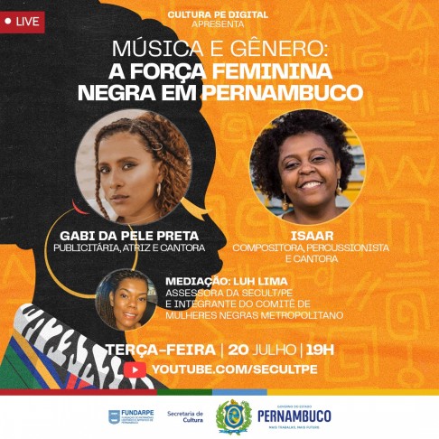As convidadas são Gabi da Pele Preta, cantora e atriz caruaruense da nova cena da música pernambucana, e Isaar, cantora com carreira consolidada no Estado. Neste debate sobre o protagonismo negro e feminino na música pernambucana, a mediação fica por conta de Luh Lima, assessora técnica na Coordenadoria de Literatura da Secult-PE e membro do Comitê de Mulheres Negras Metropolitanas de Pernambuco (CMNM-PE).
