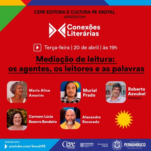 O webinário Conexões Literárias deste mês vai debater a mediação da leitura. O encontro, que é uma parceria entre a Secult-PE e a Cepe Editora, será transmitido na próxima terça-feira (20), a partir das 19h, pelos canais do YouTube dos organizadores. Sob o tema “Mediação de Leitura: os agentes, os leitores e as palavras”, a live tratará da importância da leitura e dos mediadores, de forma geral, e tomará o exemplo do projeto “A Gente da Palavra” parceria entre as entidades como um bom exemplo de ação de mediação.