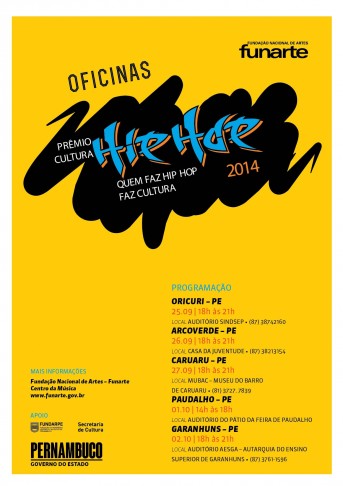Para participar da oficina, não é necessário fazer a inscrição. Basta chegar ao local indicado em cada cidade, com antecedência ao horário que a atividade começa a ser realizada. Sendo uma iniciativa da Diretoria de Políticas Culturais da Secult-PE, através da Coordenadoria de Música em parceria com o Minc/Funarte, as oficinas também servirão de parâmetro para a identificação e o fortalecimento da cultura Hip Hop no Estado.
