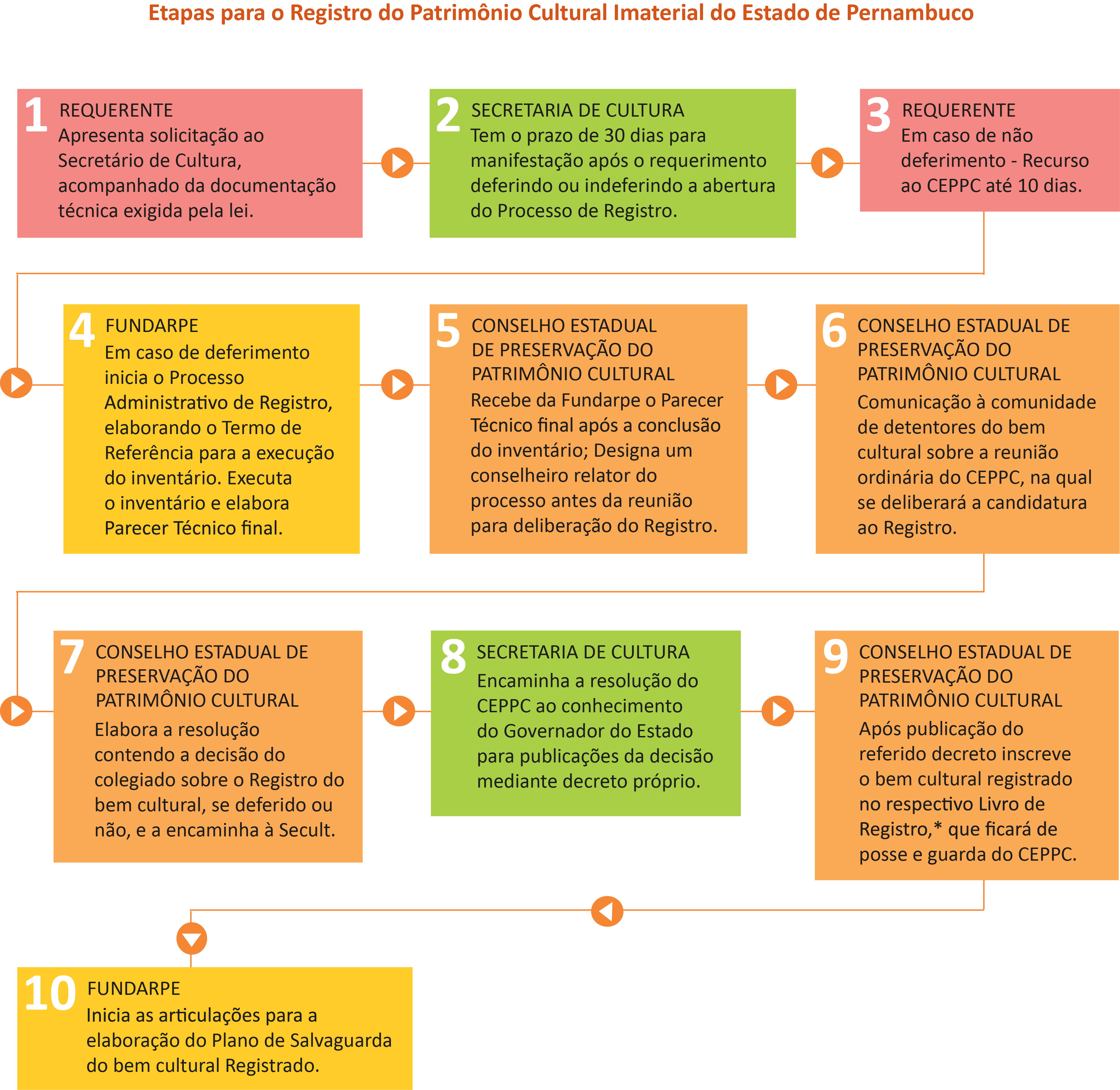 O primeiro passo é elaborar um requerimento formalizando a intenção dos detentores do bem cultural em obter o registro do bem cultural específico, acompanhado de documentação e subsídios suficientes que possibilitem a abertura do processo e destaquem a relevância deste bem e a importância de inseri-lo entre os Patrimônios Culturais Imateriais de Pernambuco.