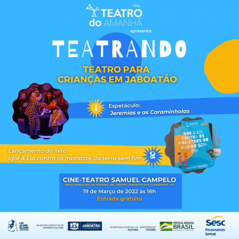 A iniciativa, contemplada pelos recursos da Lei Aldir Blanc em Pernambuco, integra o projeto Teatrando – Teatro para crianças em Jaboatão, capitaneado pelo grupo jaboatonense Teatro do Amanhã. Após a exibição da peça, haverá o lançamento do livro “Igor & Lia e os monstro do mundo sem fim”, um texto teatral para crianças, escrito pelo ator e diretor Rodrigo Hermínio, que aborda as temáticas da depressão e ansiedade na infância.