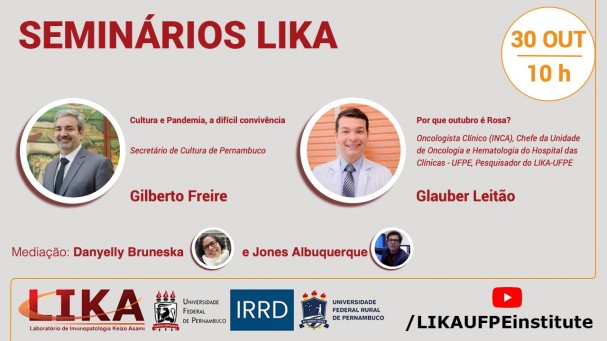 Além do secretário estadual de Cultura de Pernambuco, o bate-papo contará com a participação do médico Glauber Leitão, chefe da Unidade de Oncologia e Hematologia do Hospital das Clínicas da UFPE, que vai falar sobre o Outubro Rosa. A mediação do encontro virtual, que será transmitido pelo www.youtube.com/LIKAUFPEinstitute, ficará a cargo de Danyelle Bruneska e Jones Albuquerque.