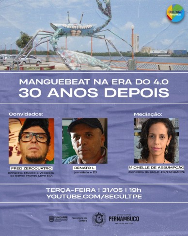 LIVE - Pensar o movimento mangue à luz dos novos tempos conduz a conversa da live “Manguebeat na era do 4.0: 30 anos depois”, que acontece nesta terça-feira (31), às 19h, no canal do Youtube e Facebook da Secretaria de Cultura e Fundarpe. Os convidados são seus autores: Fred Zero Quatro e Renato L. Eles vão conversar com a jornalista da Secult-PE, Michelle de Assumpção.