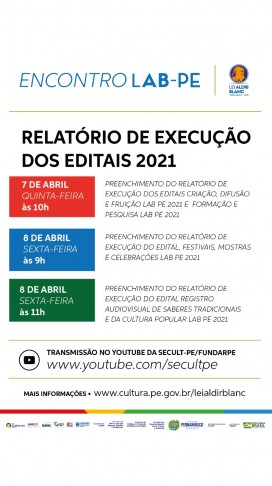 A Secretaria de Cultura de Pernambuco (Secult-PE) realiza, nos próximos dias 7 e 8 de abril (quinta e sexta-feira), mais uma série de Encontros LAB-PE. Desta vez, a pauta girará em torno dos relatórios de execução que os proponentes deverão entregar na conclusão dos projetos selecionados pela Lei Aldir Blanc em Pernambuco.