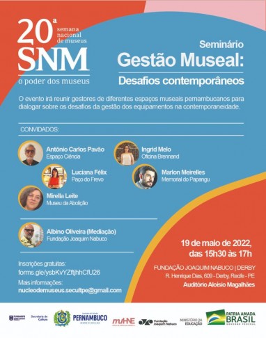 Criada com o objetivo de aprofundar a relação da população com as instituições responsáveis pela preservação da memória e difusão do conhecimento no País, a Semana Nacional de Museus chega à sua vigésima edição com o tema “O poder dos museus”. No Recife, a Secretaria de Cultura de Pernambuco (Secult-PE) promove o seminário “Gestão Museal: desafios contemporâneos”. Realizado em parceria com a Fundação Joaquim Nabuco (Fundaj), o evento ocorre presencialmente no dia 19 de maio (quinta-feira), das 15h30 às 17h, no Auditório Aloísio Magalhães, no Derby.