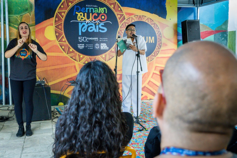 A forte tradição pernambucana em recitais de poesia foi comprovada hoje durante as ações do País da Literatura do Festival Pernambuco Meu País. De tarde, Quem descobriu o azul anil? de David Biriguy ocupou a Fábrica de Criação Popular do Sesc, à noite o recital Nua aos 70 trouxe poesias recitadas pela autora Graça Nascimento.