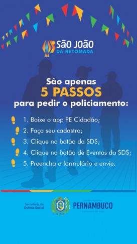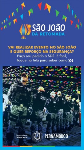 O reforço do policiamento estará disponível para eventos marcados para ocorrer entre 2 de junho e 3 de julho. Todas as regras estão detalhadas na portaria da SDS que regulamenta o cadastro desses eventos, em: www.sds.pe.gov.br/sao-joao-2022, que também disponibiliza para leitura a Lei de Grandes Eventos de Pernambuco.